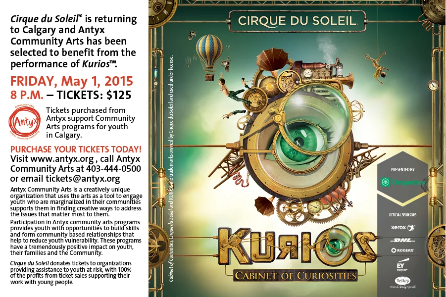 Support Antyx Community Arts by purchasing tickets to Kurios, the newest Cirque do Soleil show! 100% of the proceeds from this purchase will go directly to supporting Calgary youth at risk through our creative and skill-building programs.