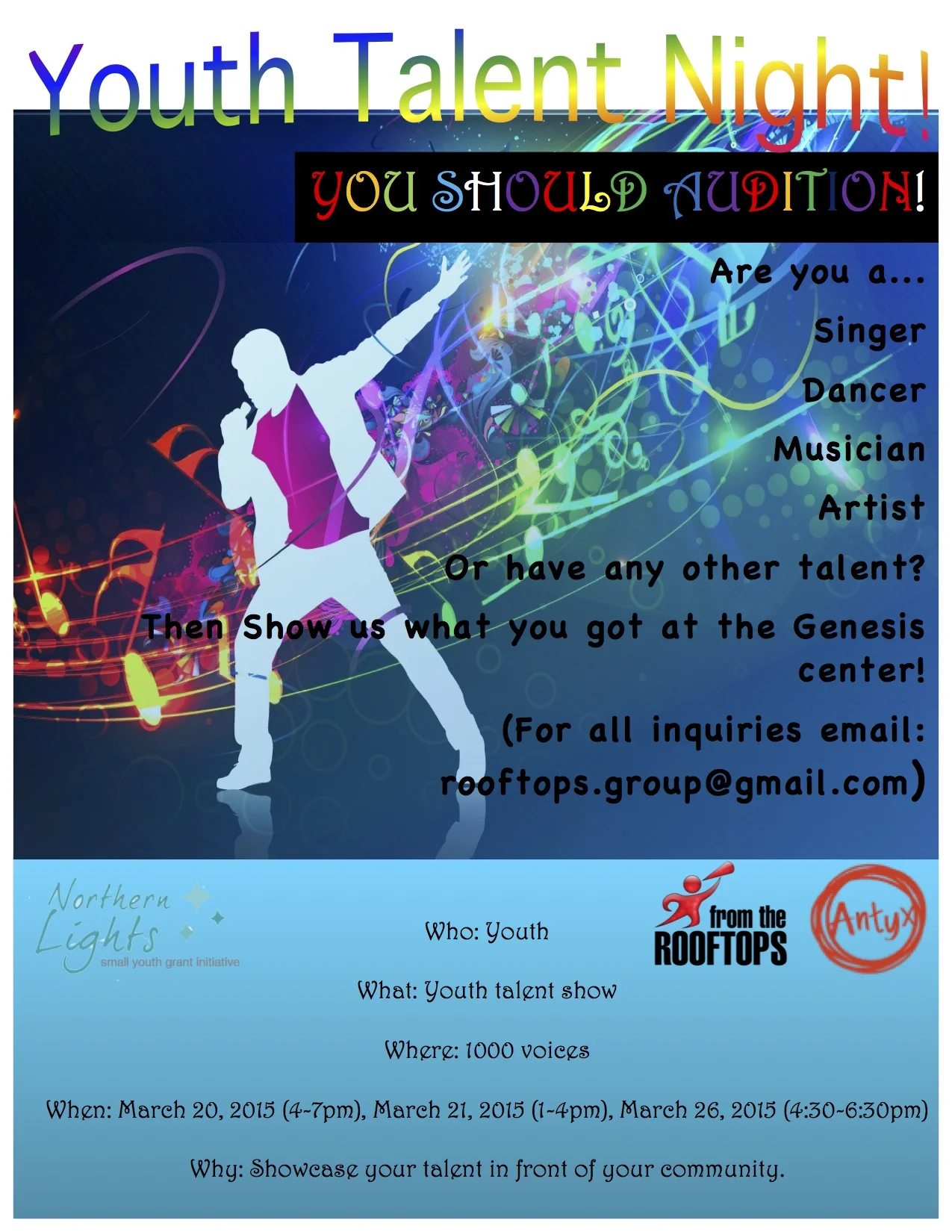 From the Rooftops is hosting auditions for our first ever Talent Night! If you sing, dance, paint, or perform in any way, we want to see YOU! Auditions are March 20, 21, or 26, at the Genesis Centre. You can schedule an audition by e-mailing rooftops.group@gmail.com!