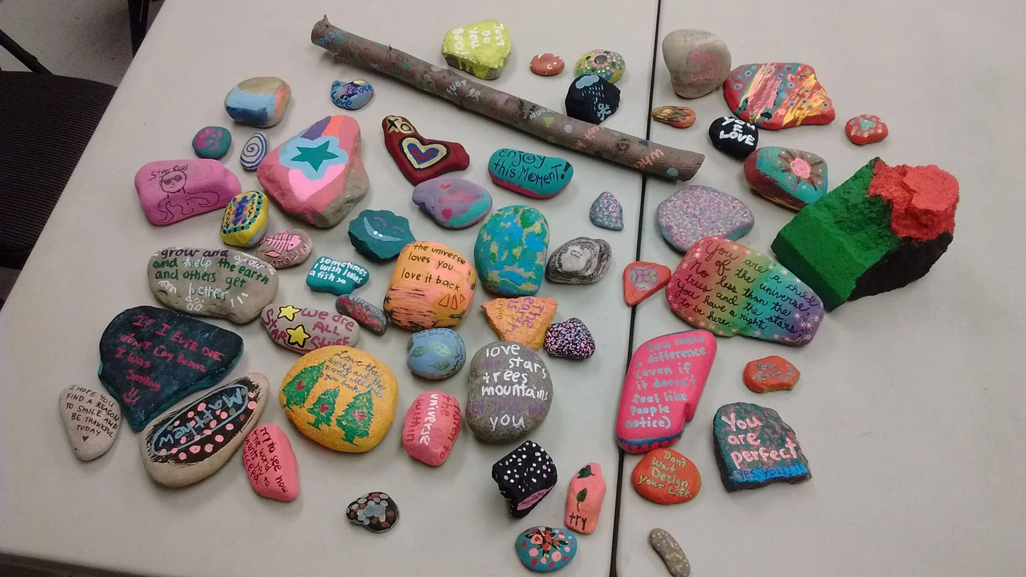 Youth from the Antyx Digital Arts group in Falconridge decided to create some art inspired by nature. They painted rocks with positive messages and placed them outside around the Falconridge community, as a form of polite graffiti to brighten people's day.